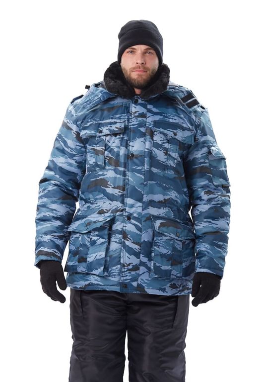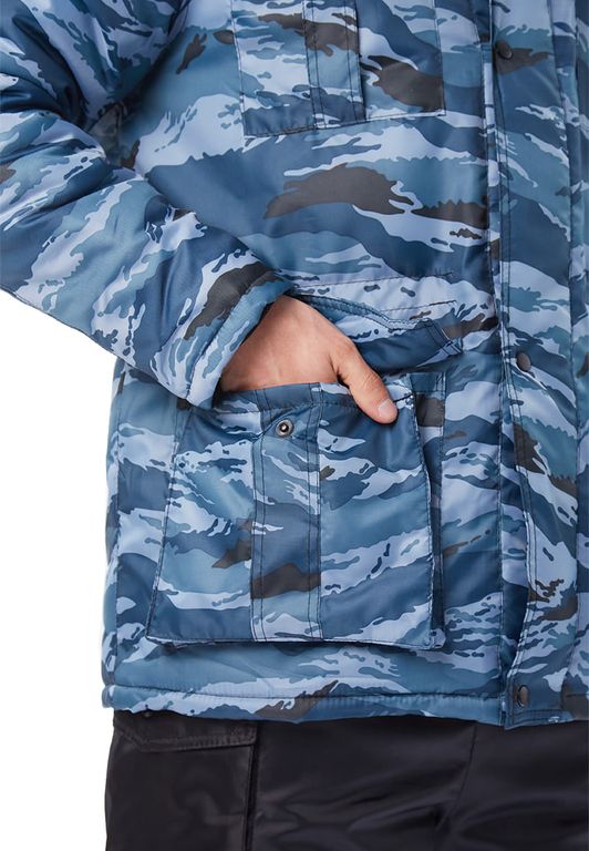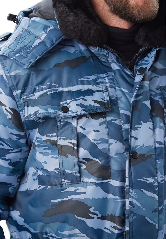 Куртка с застежкой на молнию и кнопки, меховым воротником, утепленным капюшоном. На куртке накладные объемные карманы, внутренний карман для документов, погоны на кнопках. Нижние карманы утеплены. Объем куртки регулируется по линии талии.
